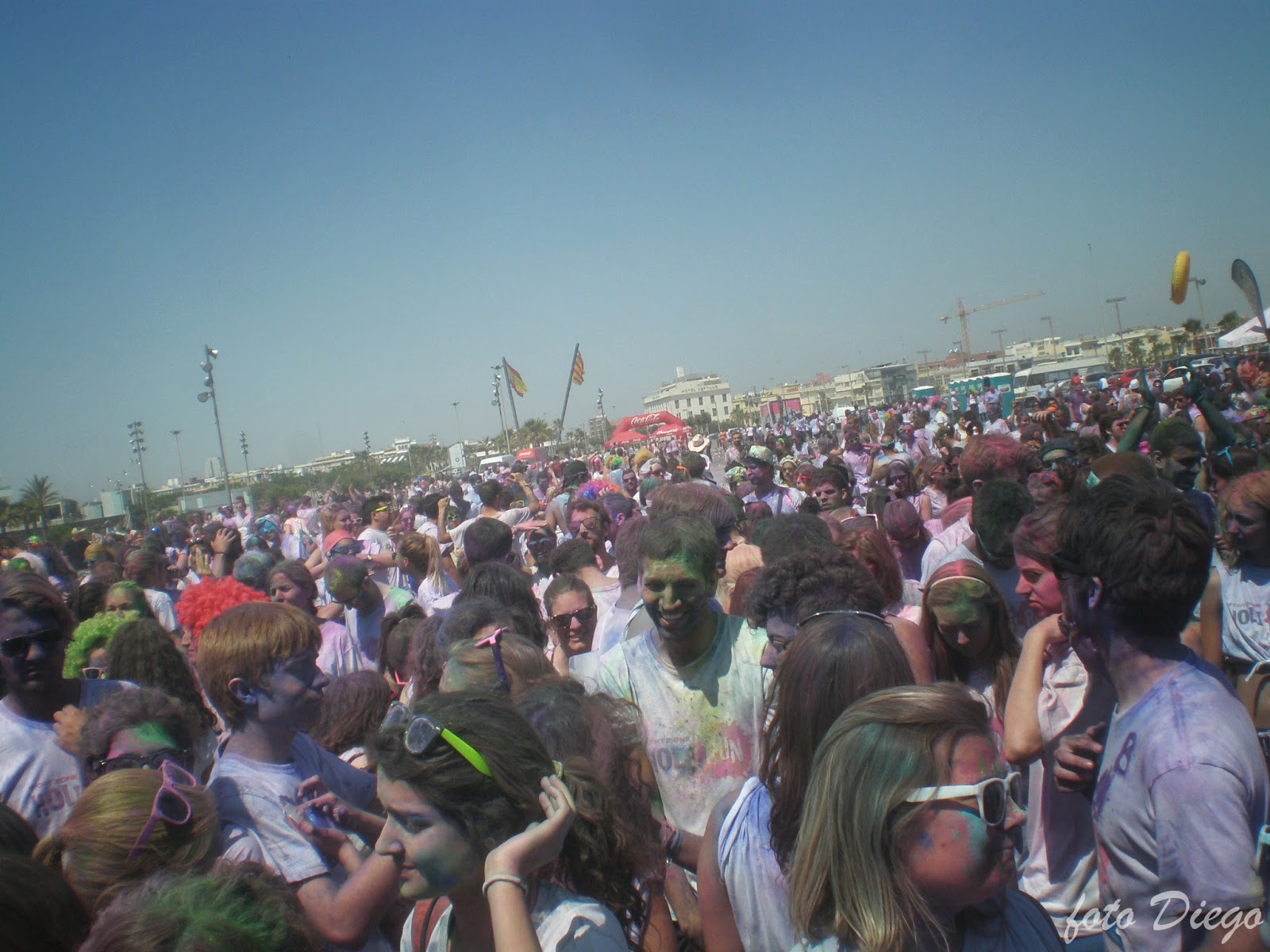 Una vez la carrera termina te dan una botellita de agua o una cocacola, también en Valencia daban cafés fríos de kaiku. No termina todo después de hidratarse, queda un concurso de disfraces para el que más se lo ha currado y el «holi boom» que es cuando todos lanzan los polvos hacia arriba (¡si no los has usado ya!).