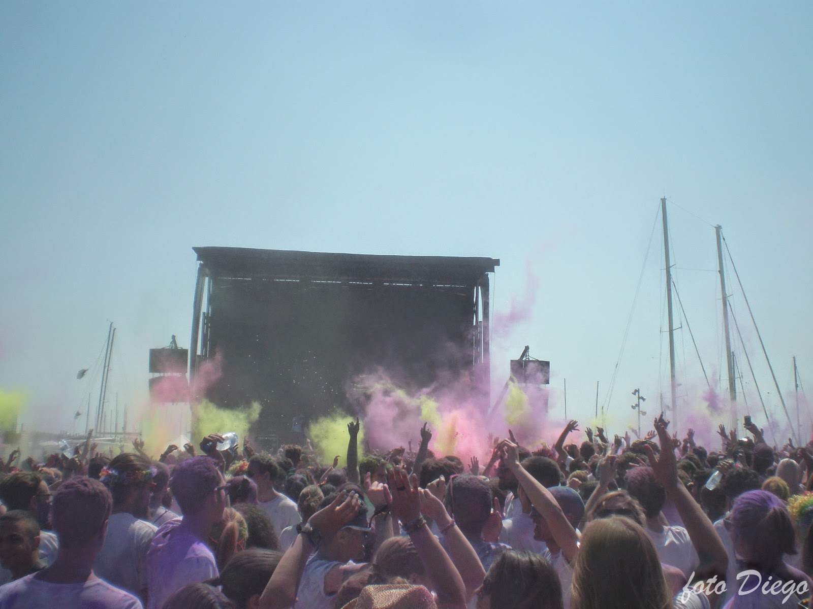 Las entradas se pueden comprar a través de la web oficial del evento y oscilan entre los 13€ si compras en grupo o 15€ si es individual (precios del año 2014). También pueden participar niños por 10€. Como podéis ver no es una carrera barata, y en el kit que te dan sólo está la camiseta oficial, el dorsal y una bolsita de polvos de un color. Aún así, merece la pena! Yo volveré a repetir…fue muy muy divertido.El ambiente es genial, puedes ver a todo el mundo con diferentes accesorios: pelucas, tu-tus, gafas de sol, disfraces… todos unidos para hacer deporte! Además ponen un escenario para caldear el ambiente antes de la carrera con buena música y para cuando termina poder continuar la fiesta. Al empezar la carrera se hacen diferentes salidas espaciadas en unos 5-10 minutos para que no se aglomere demasiado la gente al pasar por los arcos de colores, ya que al llegar a ellos la gente se detiene para que les lancen polvos del color del arco. Había 5, uno por cada kilómetro: amarillo, rosa, verde, azul y morado.