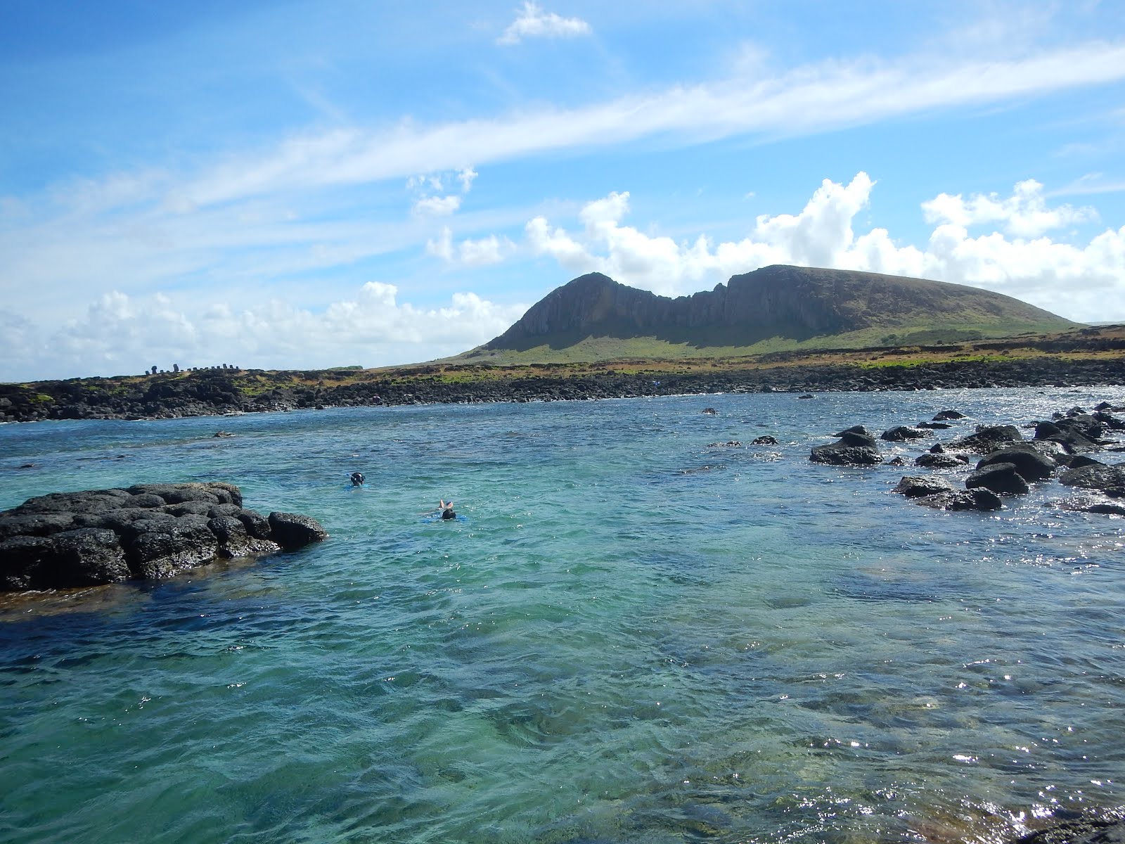 Ed no aprendió la lección después del susto en Rio de Janeiro y en la Isla de Pascua repitió, pero esta vez realmente se asustó y pensó que no salía del agua. Fuimos a bañarnos justo detrás del volcán Rano Raraku y del Ahu Tongariki, uno de los conjuntos de Moai más conocido (los 13 moai), y aunque no había mucho oleaje sí había corriente. Ed se salió de la zona que era como una pequeña bahía y de repente desapareció. Al volverlo a ver estaba cogido a una roca. Después de recuperar el aliento me contó que la corriente lo arrastraba alejándolo de la costa y por mucho que nadaba no conseguía volver, que nadó todo lo rápido que pudo y consiguió cogerse de una roca, sin importarle que hubiera erizos de mar, se subió y pudo salir. Se hizo varias heridas a causa de las púas en un costado, en una mano y en un pie. Después de este susto empezó a tenerle un gran respeto al mar.