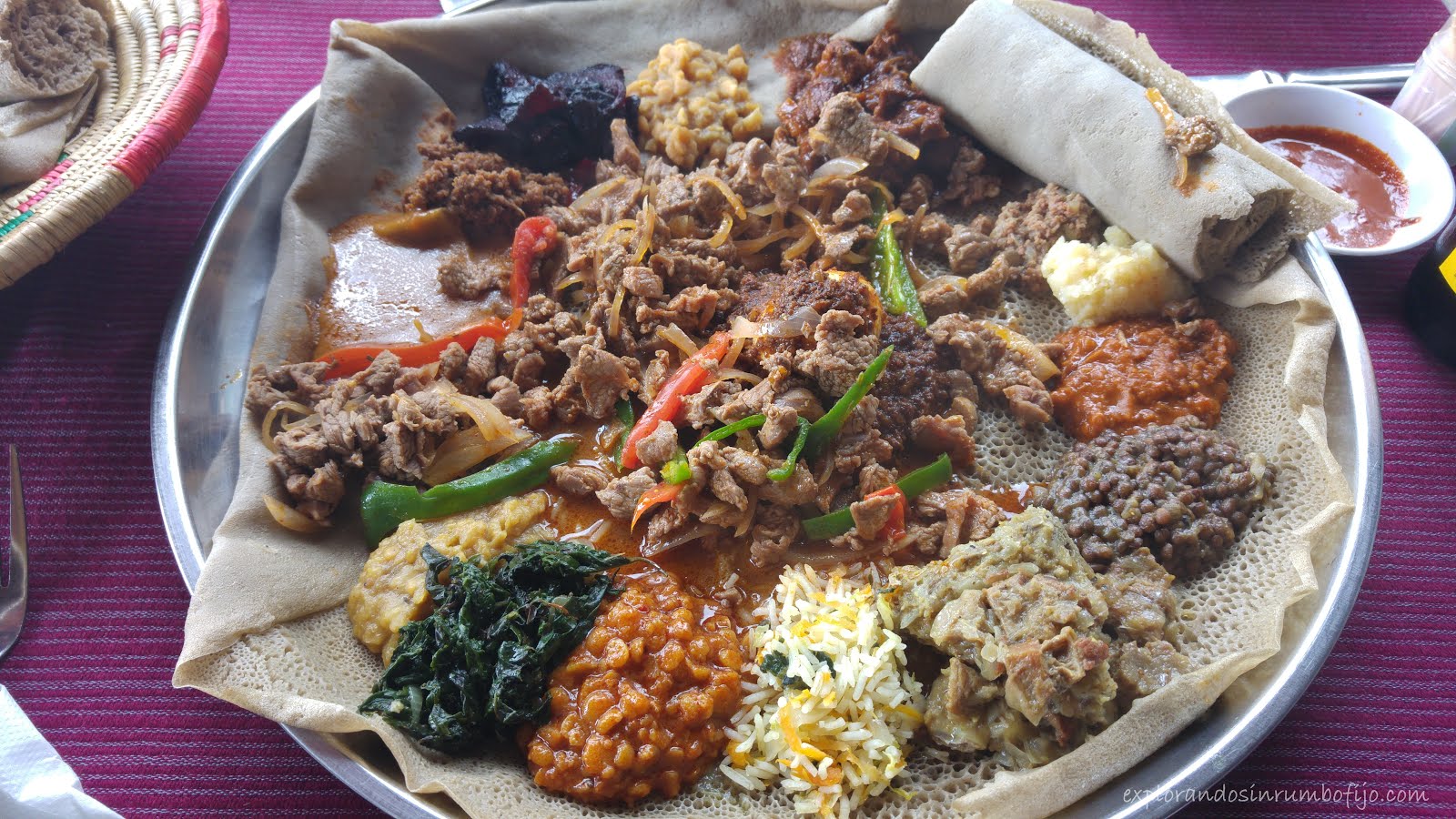 Después de tanto paseo ya con hambre fuimos a un restaurante que nos recomendó el guía, (Four Sisters) bastante turístico pero manteniendo las tradiciones, con platos típicos y buen servicio. Comimos injera con wat, una especie de curry a lo etíope, y para beber una cervecita St George!