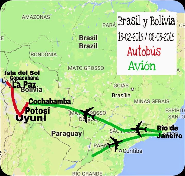 Desde Puerto Iguazú (Argentina) cruzamos a la parte brasileña de las cataratas, Foz do Iguaçu. Volamos hasta Rio para pasar los carnavales allí y después volamos hasta Cochabamba, haciendo un recorrido por Bolivia hasta el lago Titicaca.