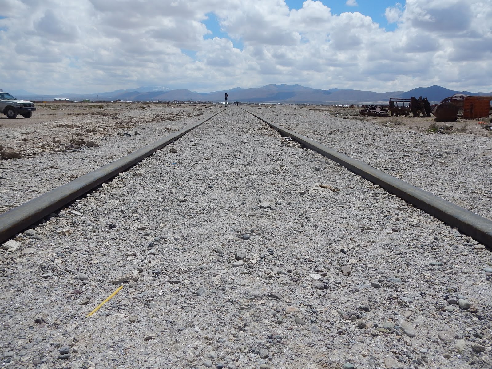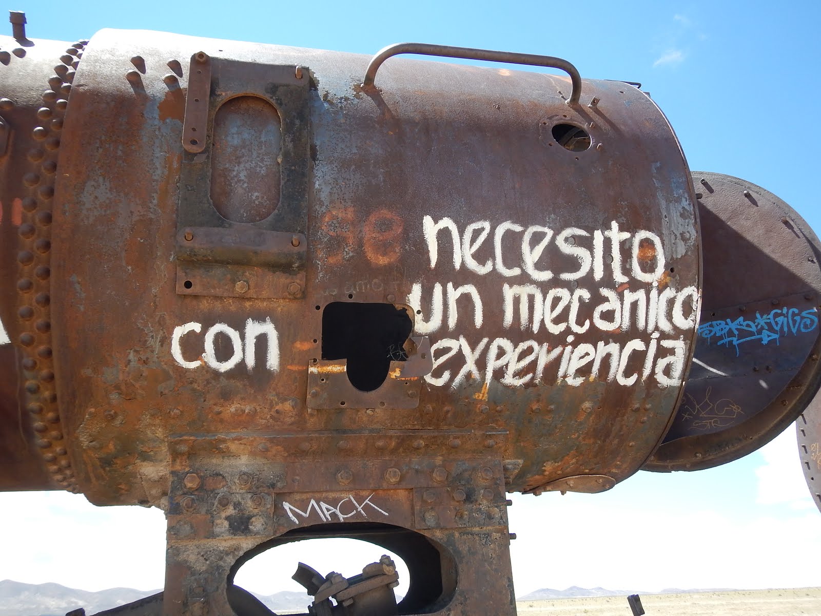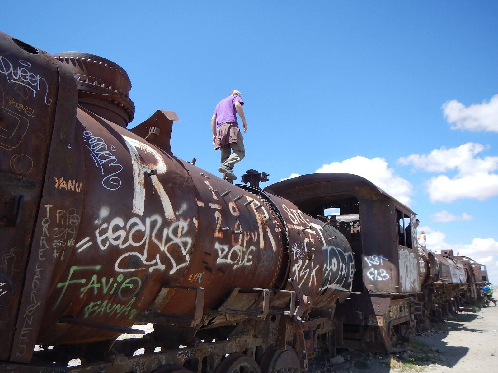 A las 9 llegamos a la oficina de Esperanza y dejamos allí las mochilas grandes, cogiendo sólo lo más necesario para los próximos 3 días. Salimos alrededor de las 10 de la mañana con otros tres acompañantes en el coche (dos chicas alemanas y un chico holandés) y nuestro conductor y guía Dani. La primera parada fue el cementerio de trenes, a las afueras del pueblo, que antaño comunicó Uyuni con Antofagasta (Chile). Cuando cayó en desuso se empezaron a desarmar los trenes que ya no se usaban, y la gente se llevaba piezas, hasta que se vio el potencial que tenía para llevar a los turistas y añadirlo a los tours.